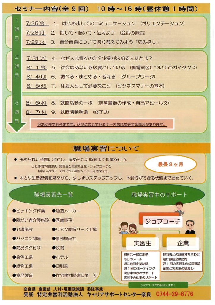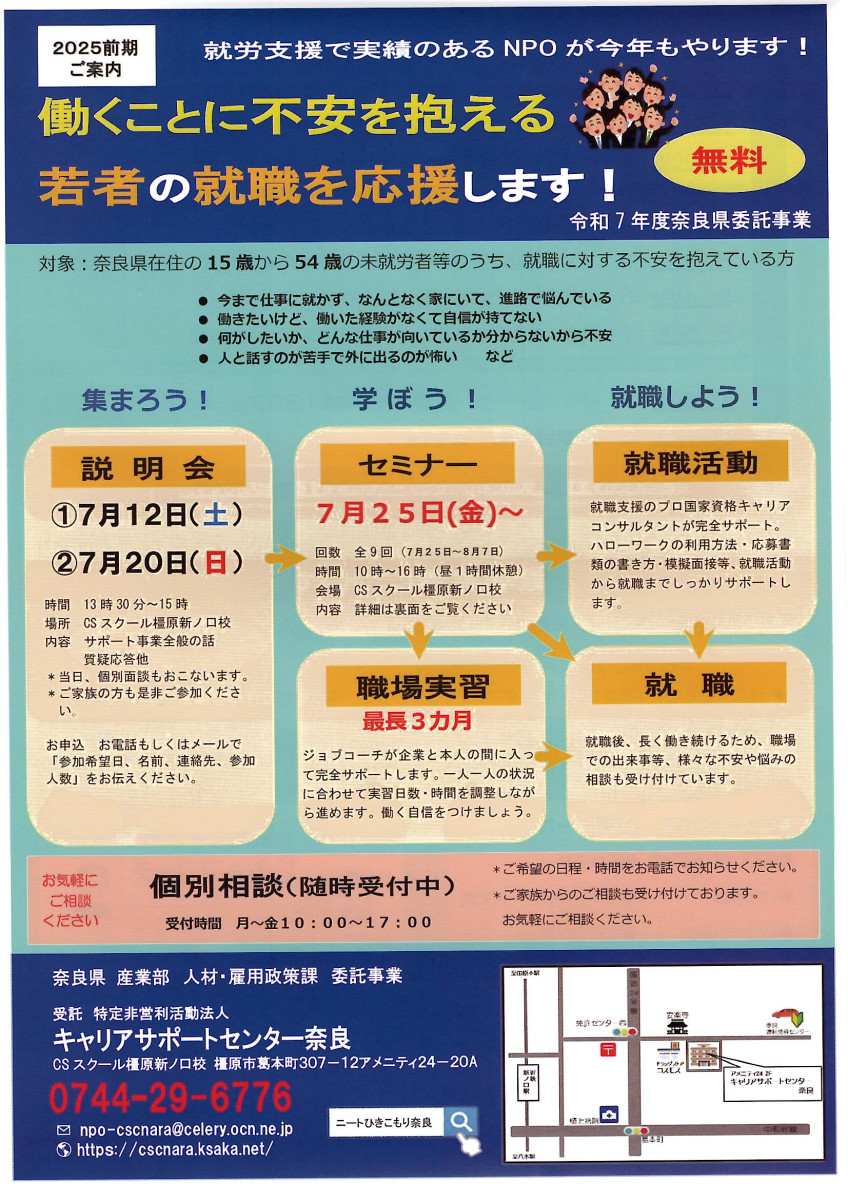 ユースネットいこまのネットワークである 特定非営利活動法人 キャリアサポートセンター奈良が、働くことに不安を抱える若者の方の就労支援をいたします。