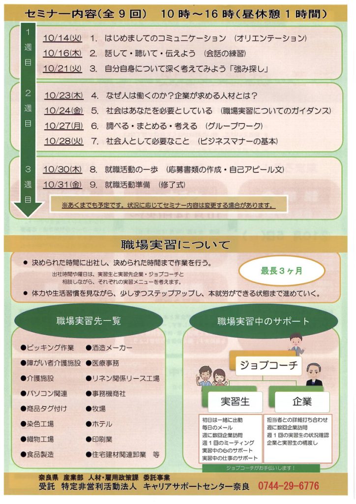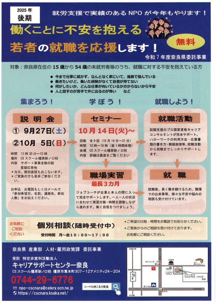 ユースネットいこまのネットワークである 特定非営利活動法人 キャリアサポートセンター奈良が、働くことに不安を抱える若者の方の就労支援をいたします。