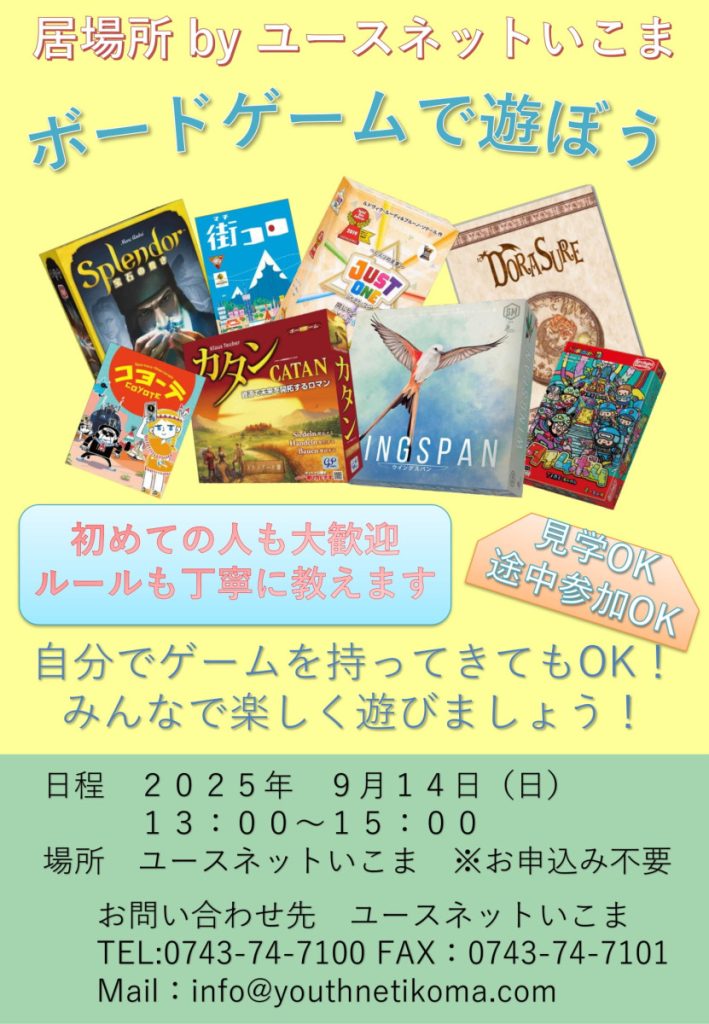 【9月開催】ボードゲームイベントのお知らせ 2025/08/12 日時:2025年9月14日(日 )13:00~15:00 場所:ユースネットいこま 生駒市北新町12-32 教育支援施設2階 お問合せ:ユースネットいこま 電 話:0743-74-7100 FAX:0743-74-7101 メール:info@youthnetikoma.com
