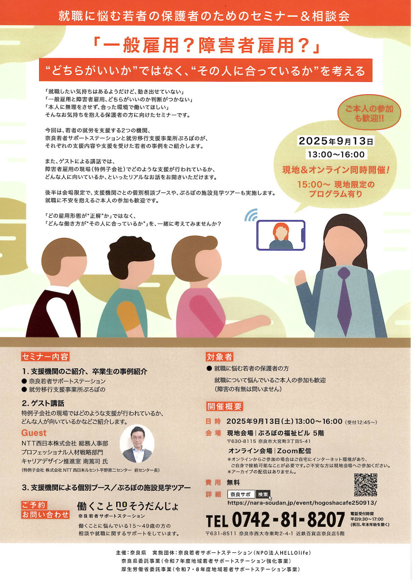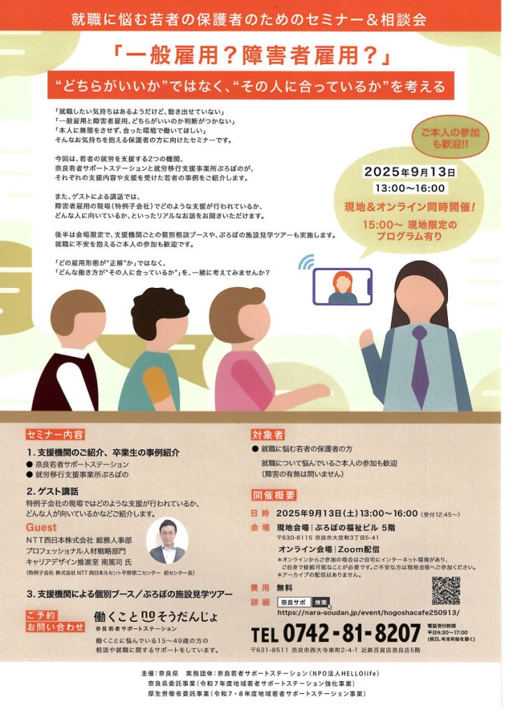 ユースネットいこまのネットワーク機関である奈良若者サポートステーション主催の「就職に悩む若者の保護者のためのセミナー&相談会」を開催致します。
