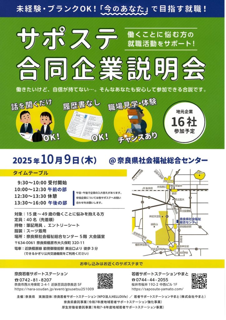 ユースネットいこまのネットワーク機関である若者サポートステーションやまと・奈良若者サポートステーション主催の「サポステ合同企業説明会」を開催致します。